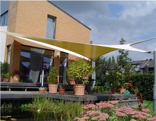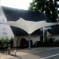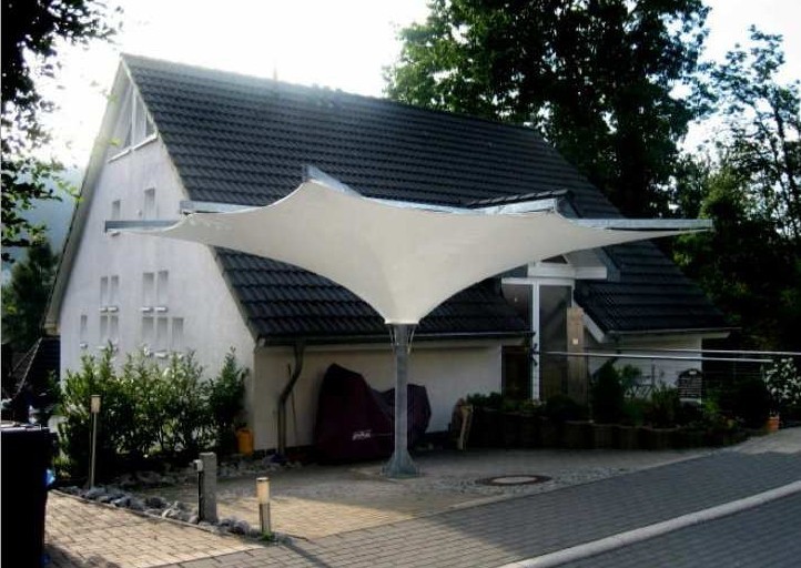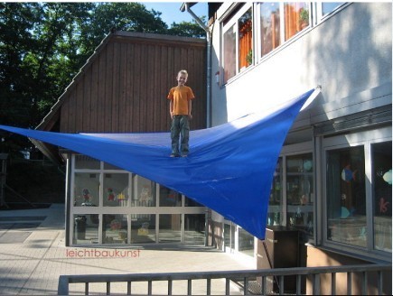 Das weiße Stretch-Segel (permanent B1 gemäß DIN 4102) weist sechs Eckpunkte auf; zwei integrierte Querbögen geben der aufgespannten Fläche die unverwechselbare, räumliche Kontur.