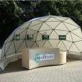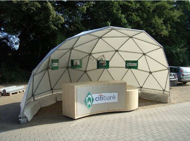Größe: Der Pavillon hat einen Durchmesser von 16 m, eine Höhe von 4,25 m und bietet mit seinen annähernd 200 m² viel Raum für Ihren Einsatz. Der Aufbau im Innenraum erfolgt an einem Tag, im Außenbereich je nach Gründung sind 2 - 4 Tage erforderlich.