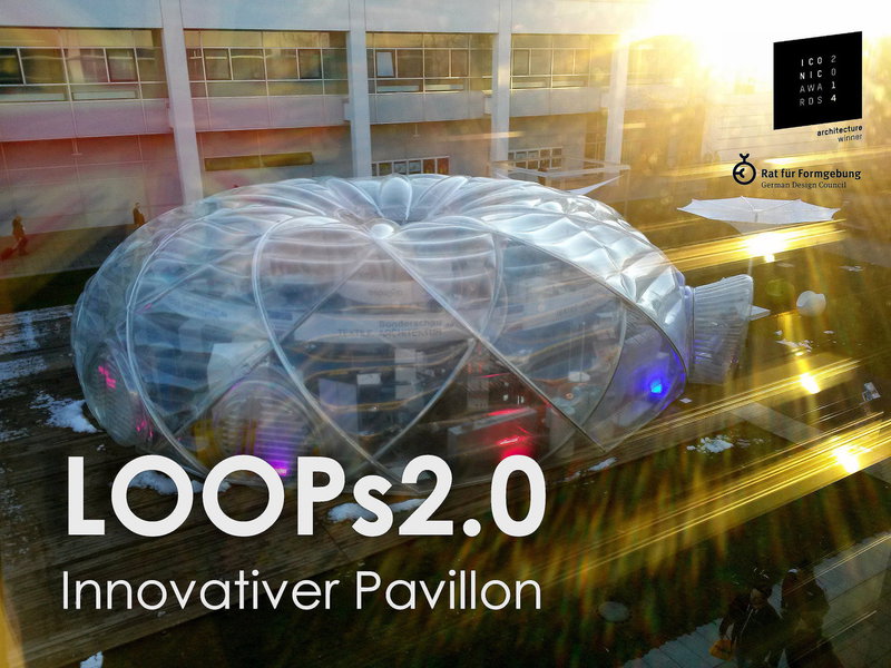 LOOPs2.0 ist ein innovatives Pavillonkonzept, das die Aufmerksamkeit für das Thema „Textile Architektur“ wecken soll und dies auch schafft. Die Bespannung des formgebenden Skeletts mit transparenten Folienkissen und Sonnensegeln gewährt genügend Ein- und Ausblicke und wirkt so einer Schwellenangst entgegen. Dank der transparenten Bespannung wirkt die Beleuchtung nach innen und außen, wobei die Hülle zugleich auch externe Lichtquellen reflektiert und insgesamt zu einem faszinierendem Raumerlebnis beiträgt. Ein minimalistisch-elementiertes Konzept, das perfekt die Verzahnung von Gestaltung, Ingenieurleistung und handwerklicher Ausführung verkörpert.